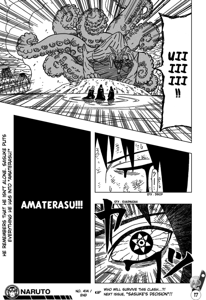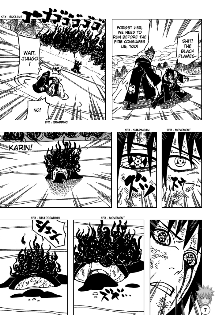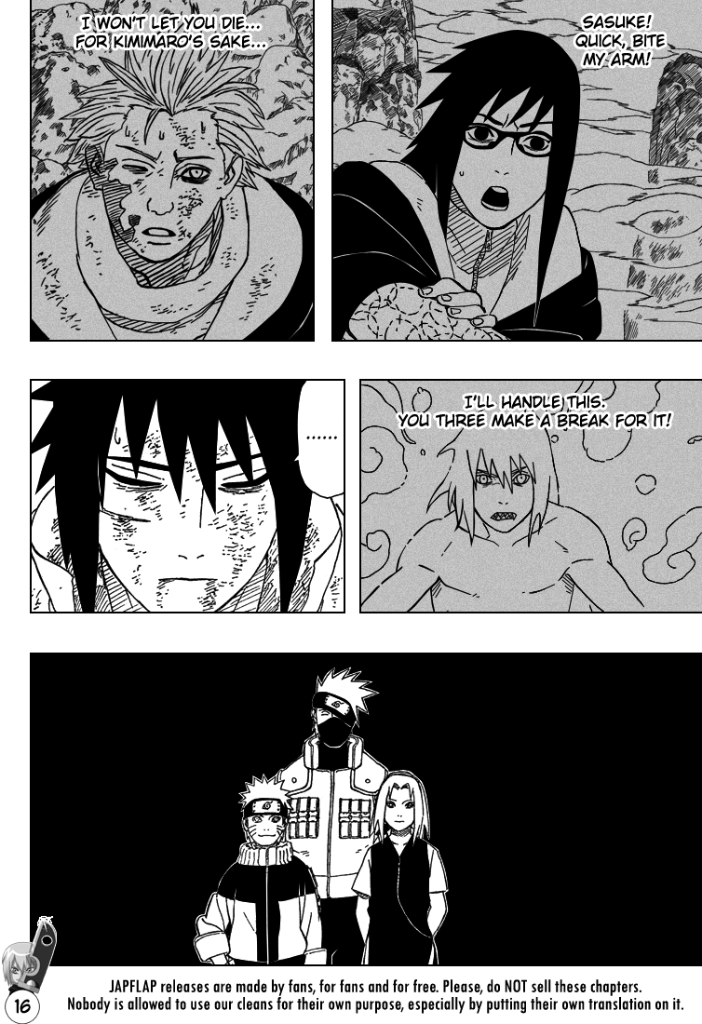And Karin; Karin he outright betrays and sacrifices. But this is important; because if Sasuke simply did not care about Karin, or simply considered her "a tool", Kishi wouldn't have used her as the threshold for the moment Sasuke "plunges into real darkness!" (as showcased by the chapter titles, side-text, and couple of spreads) - because it simply would not have had any emotional value.